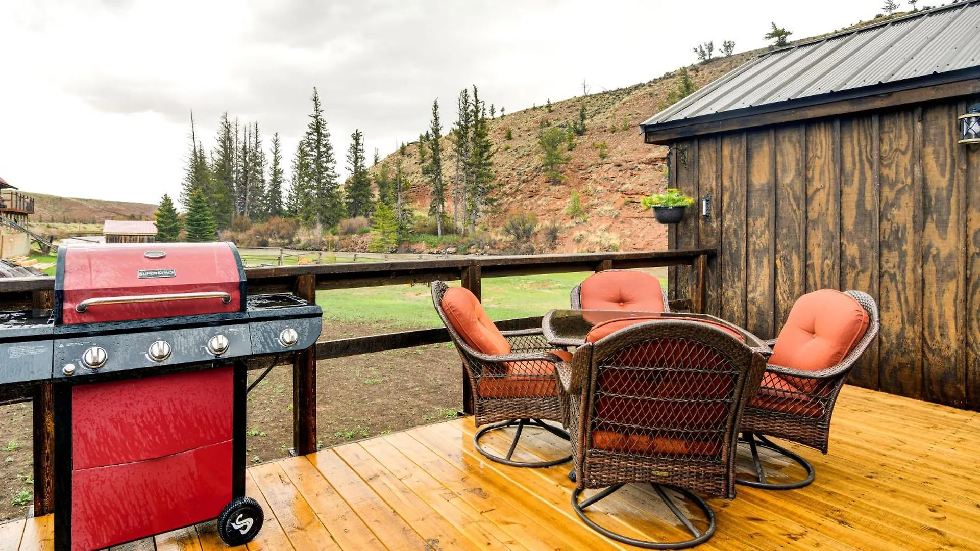 Die Villa in Dubois ist mit einer Mikrowelle, einem Kühlschrank und einem Herd für die Selbstversorgung in einen Essbereich im Freien ausgestattet.